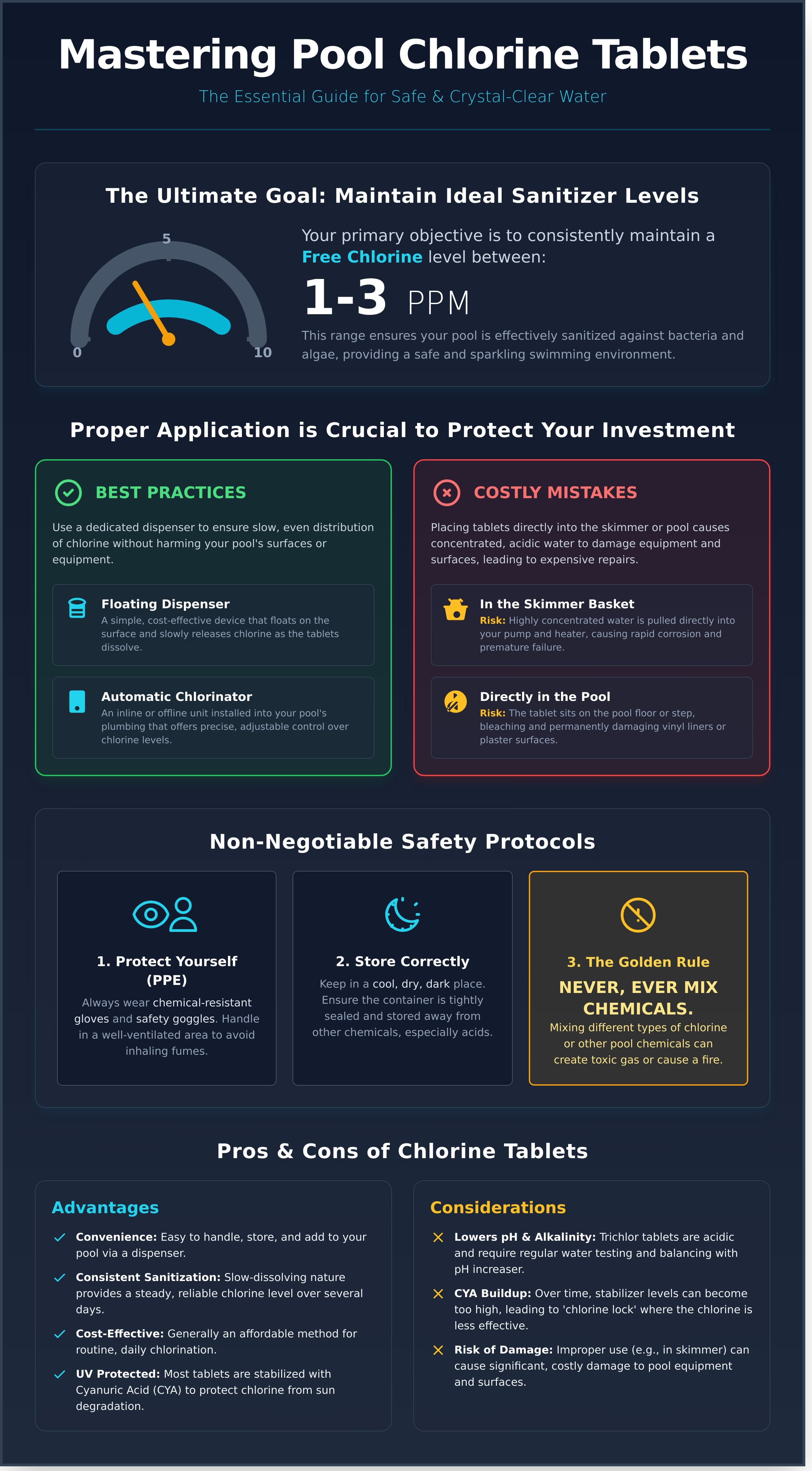 Using chlorine tablets effectively is about achieving consistency. The goal is to maintain a stable Free Chlorine level between 1-3 parts per million (ppm) to ensure your water is always sanitised and safe for swimmers. Following a correct process not only keeps your family healthy but also protects your pool's surfaces and equipment from damage.