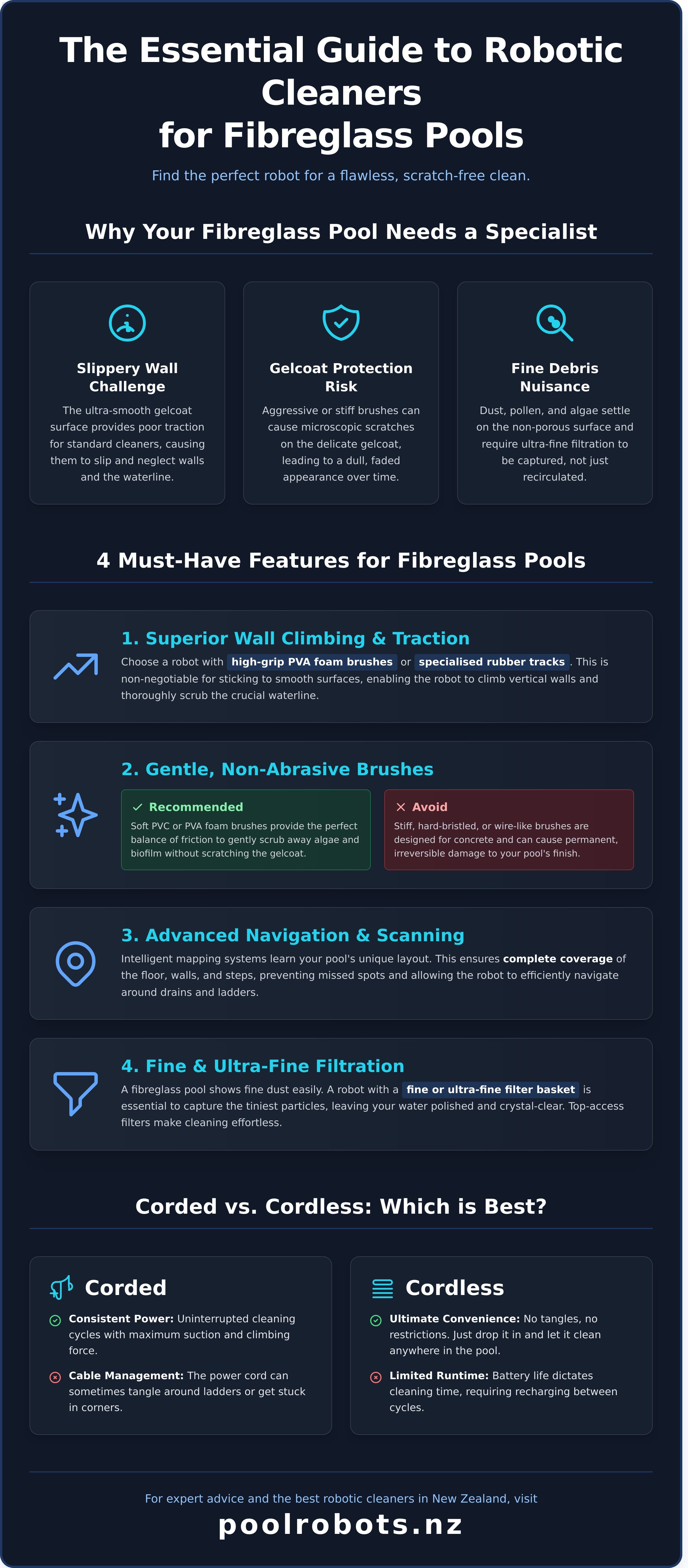 Is your pool cleaner constantly slipping on the slick walls of your fibreglass pool? Are you worried that the wrong machine could scratch or damage its delicate gelcoat surface? You’re not alone. Finding the perfect robotic pool cleaner for fibreglass pools is a common challenge for Kiwi owners, but getting it right is the secret to an effortless, crystal-clear swimming experience. It’s about more than just raw power; it’s about finding a smart, gentle robot designed specifically to grip, scrub, and polish your pool without leaving a single mark.
